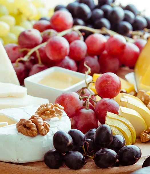A GRAND ASSORTMENT OF CHEESES, FRESH AND DRIED FRUITS, NUTS, BISCUITS AND CRACKERS.